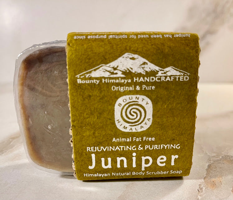 Juniper Soap Experience the refreshing and invigorating properties of exfoliating Juniper Soap. Infused with pure juniper oil and crafted with chiuri butter, coconut oil, castor seed oil, Himalayan spring water, sucrose, sunflower oil, neem seed oil, sesame oil, juniper oil, juniper leaf powder and Himalayan crystal salt, this soap provides a deep cleanse and revitalizes the skin without the inclusion of yak milk. (vegan)