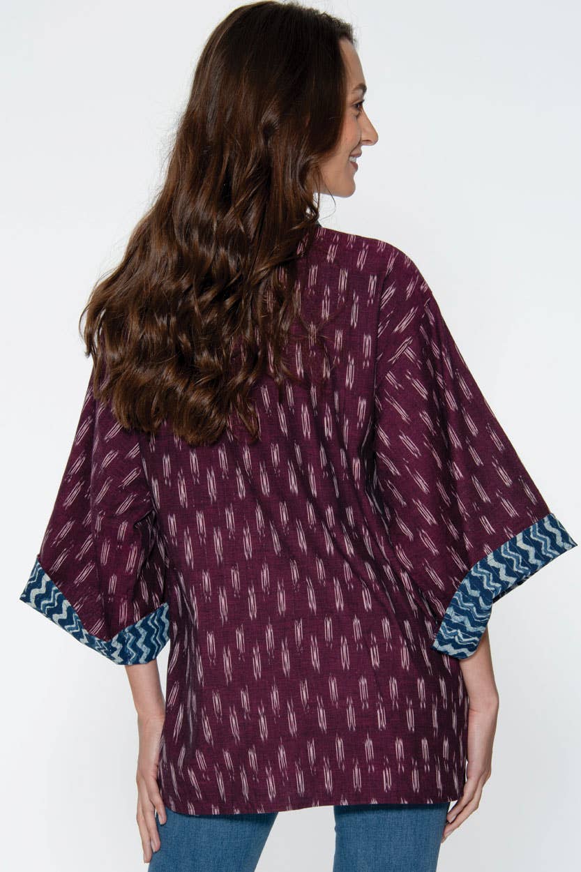 Elevate your wardrobe with our Reversible Ikat Handloom Kimonos, crafted from 100% hand-woven cotton in the exquisite Ikat weaving tradition of India. This ancient technique involves tie-dyeing the geometric patterns directly onto the yarn before weaving, resulting in a one-of-a-kind fabric that reflects the skill of master artisans. On the reverse side, you'll find stunning indigo accents and trim, adding a beautiful contrast to the design. Thoughtfully designed with pockets on one side and a convenient tie closure, these fair trade kimonos are available in two elegant colors. Lightweight and durable, these handcrafted jackets embody India’s rich textile heritage and are perfect for anyone looking for style that lasts for generations. One size fits most, 30" in length.