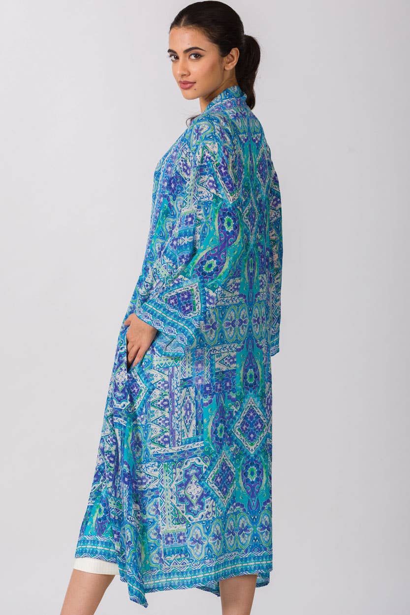 Our Sachita Kimono is designed for both style and versatility. The free-size design, featuring side slits and practical pockets, ensures a relaxed yet chic fit. Available in a range of beautiful prints and colors, each kimono exudes effortless grace and sophistication. With a length of 45 inches, it transitions seamlessly from daywear to loungewear, or even as a stylish swimsuit coverup.