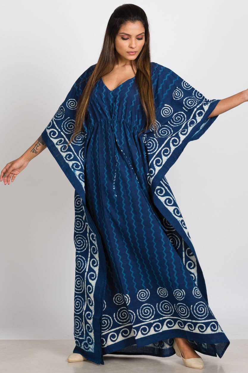 Step into a realm of artistic heritage with our Spiral Block Print Caftans, crafted from soft 100% cotton and brought to life by the skilled artisans of Rajasthan, India. This caftan is a canvas for a traditional craft, where hand-carved wooden blocks are used to hand-stamp intricate designs. Each color in the pattern is applied with a different block, showcasing the seamless precision and fine skill that has been passed down through generations.